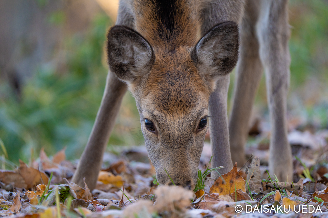 そんな森の中で若いエゾシカと出合った。深く積もった落ち葉を前肢でかき分け、植物を探し食べている。鹿の猟期が始まり警戒心の強い個体が多いなか、少しずつその距離を縮めることができた。その間、エゾシカと何度か見つめ合う時間があった。お互いの心の内を探り合うかのような、この張りつめた空気感が静謐で心地良い。