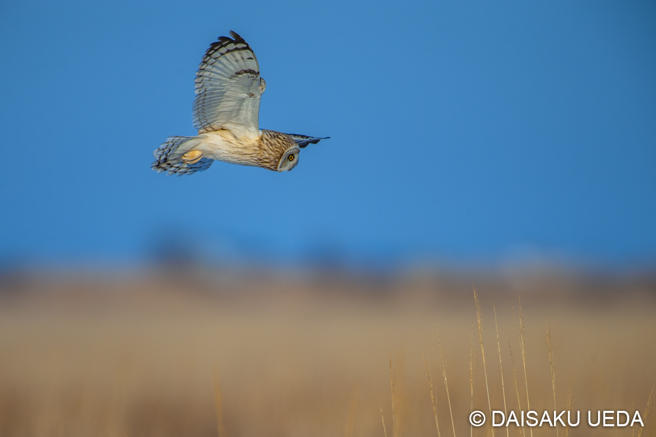 夕時の草原でコミミズクが宙に浮いているかのように翼を広げたまま、ゆっくりと飛翔しながらネズミを探していた。